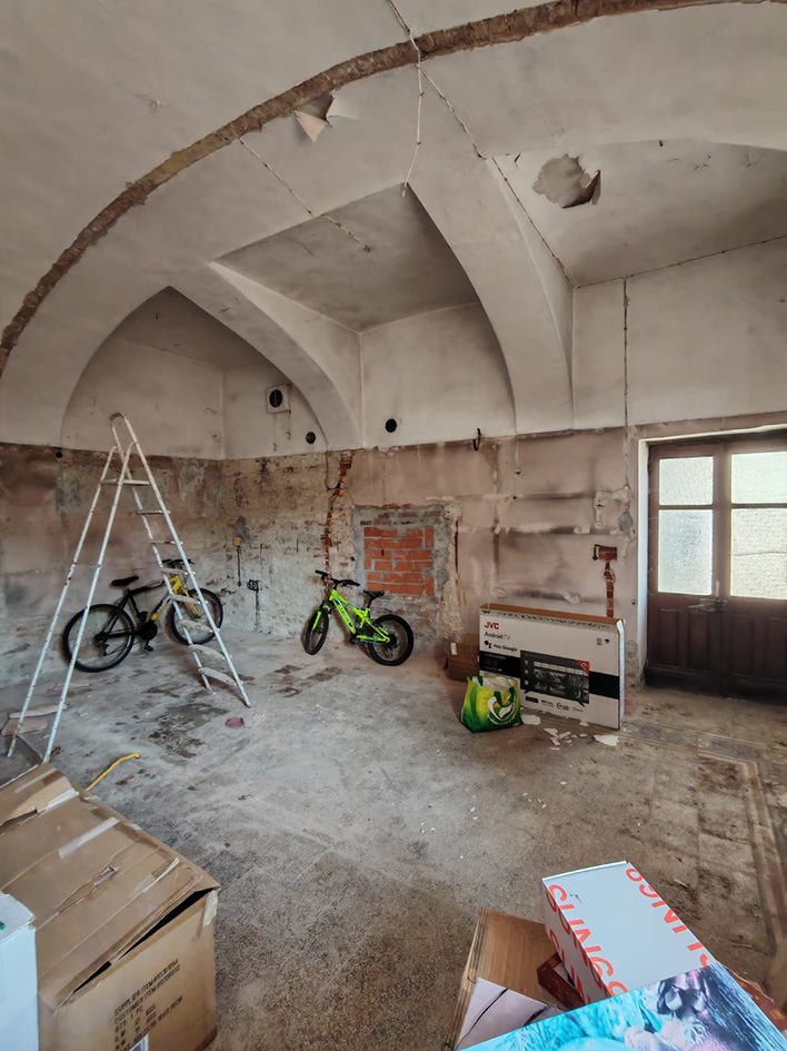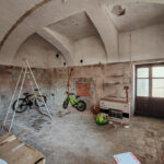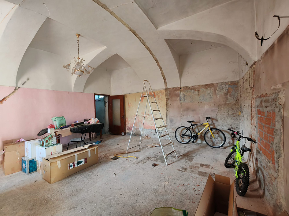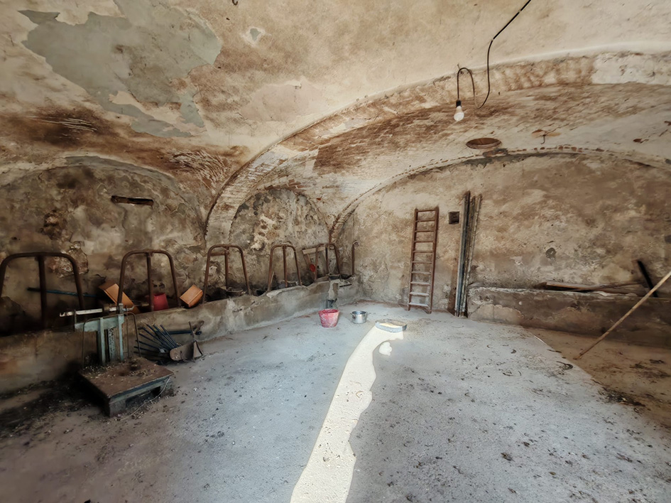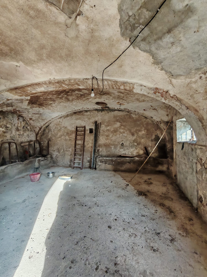 La parte abitativa al piano terreno presenta un ingresso living che conduce a un ampio salone con angolo cucina, caratterizzato da suggestive volte a vela. Al primo piano, la zona notte è composta da due camere da letto luminose e un bagno, con un balcone che si affaccia sul giardino, perfetto per le colazioni all'aperto.